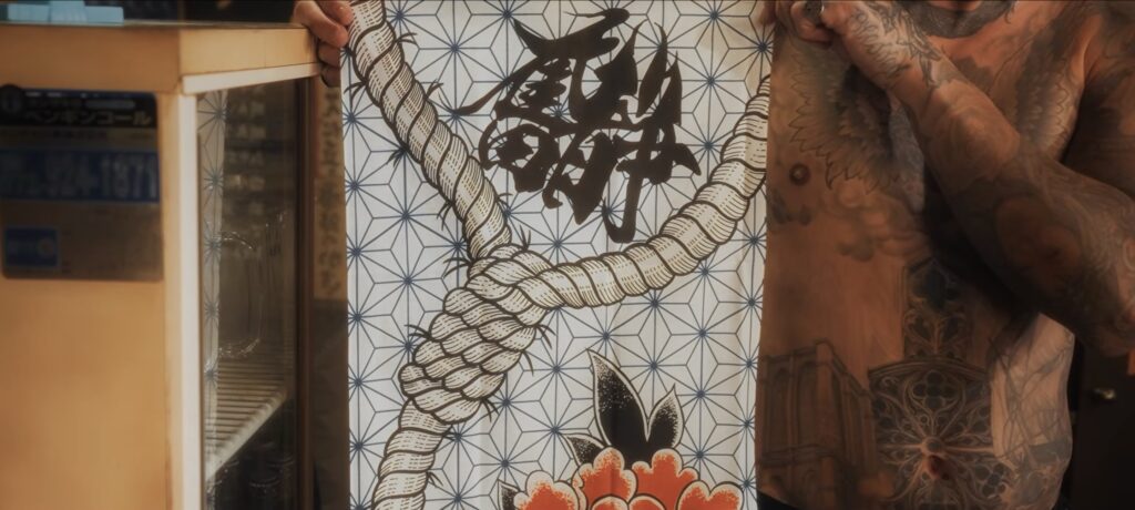 その第一弾は「ELEPHANT TATTOOのGINさん」にデザインしてもらって、僕に入っているロープと僕の相方Yusukeって言うんですけど、Yusukeが入れている牡丹の華コラボじゃないけど、お互い幼馴染みやし、ほんま同級生やし自分の好きなことを未だにやっている、その二人が何か作る手拭いだからと言ってYusukeの牡丹に僕のロープがむちゃくちゃ絡んでいるみたいなデザインをGINさんに落とし込んでもらって、第一弾の手拭いはすごい良いのができて、第二弾は僕モデルという感じで出させてもらうから、まんま自分の体に入っているタトゥーをそのまま手拭いにしようみたいな。