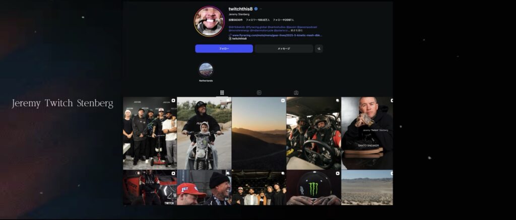 あと「Jeremy Twitch Stenberg」僕がすごいお世話になっている海外のライダーの人もブラックアンドグレーで神をほんまになんか信じているような、結構讃えている様なタトゥーが首から本当に膝ぐらいまで入っていて、格好いいなってめっちゃ思いますね。