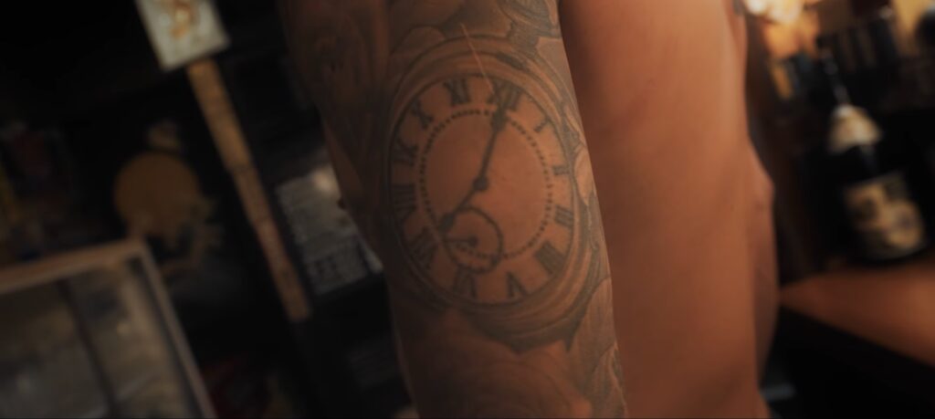 一番印象に残っているのは肩なんですけど、ここに時計が入っていてそれが朝の7時を指しているんですけど、それは僕がやっているフリースタイルモトクロスのめちゃめちゃデカい大会でX Gamesって言うんですけど、X Games2015年の招待メールが来た時間なんですよ。